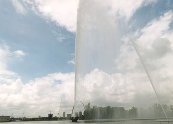 Project PortfolioGateway GeyserThe Gateway Geyser, which is the tallest fountain in the U.S. and one of the tallest in the world, is an engineering marvel. Turning it into reality took a combined effort from the two divisions of Missouri Machinery & Engineering: Hydro Dramatics and The Pump Shop at MME. The Gateway Geyser is powered by three 800 horse-power pumps, discharging 8,000 gallons of water per minute, at 250 feet per second, with an axial thrust of 103,000 pounds. The fountain has an automatic system that detects wind speed and lowers the height of the column as necessary to minimize water fallout. When wind speeds exceed 13 mph, the fountain is automatically shut down. The Geyser normally propels about 1,100 gallons of water weighing 9,200 pounds into the air. “The heart of the fountain is really the unique six-foot-tall, Swiss-designed nozzle-within-a-nozzle systems that aerates and gives a true shimmering whiteness to the water,” says Bob Korb, president of The Pump Shop at MME, who worked with Hydro Dramatics’ vice president Kerry Friedman to develop the project. Korb says that the Geyser includes a sea of complex electrical circuitry and 20-inch diameter supply piping. |